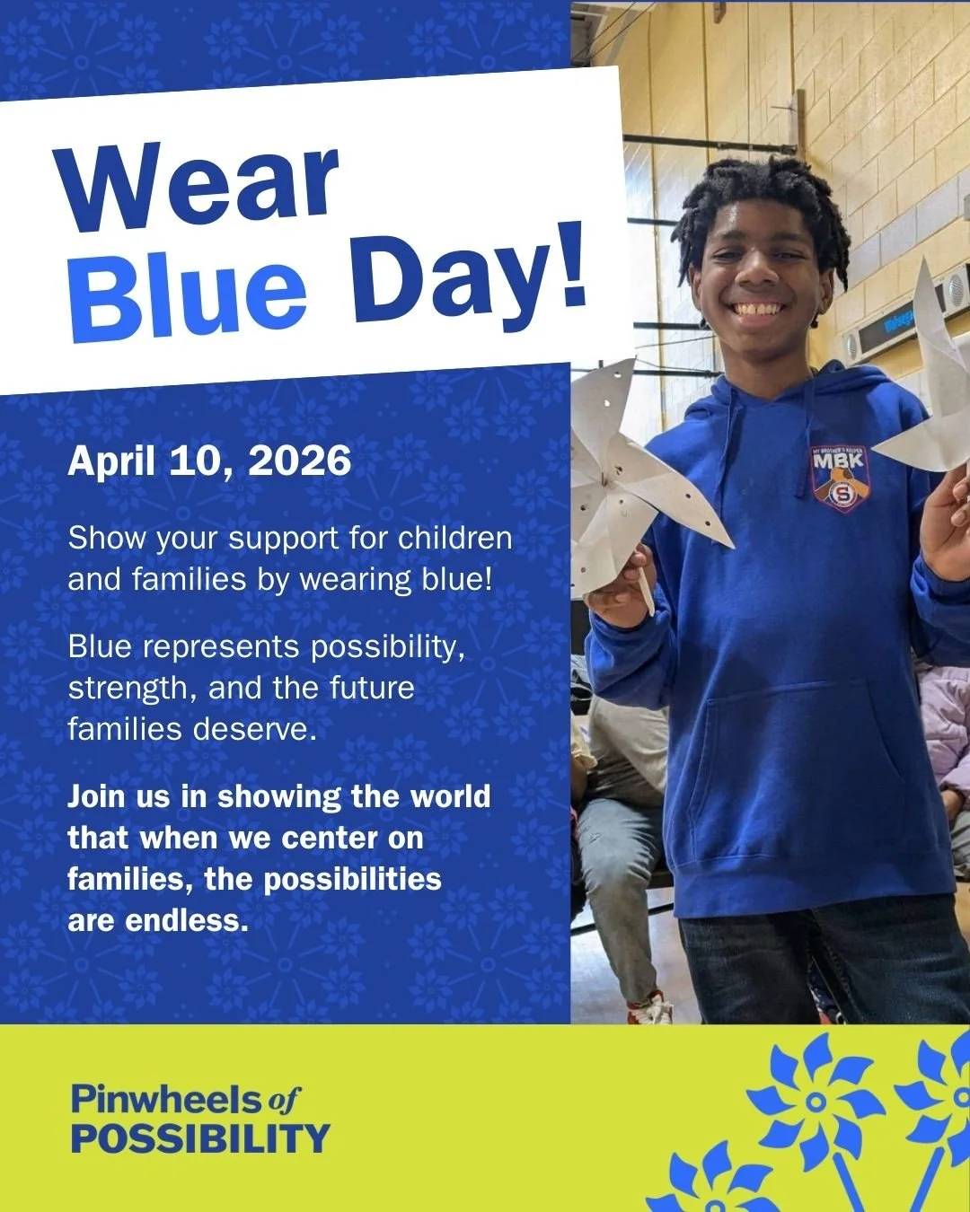 Wear blue (the symbolic color for child abuse prevention) and post a photo/video to show your commitment to prevention.
