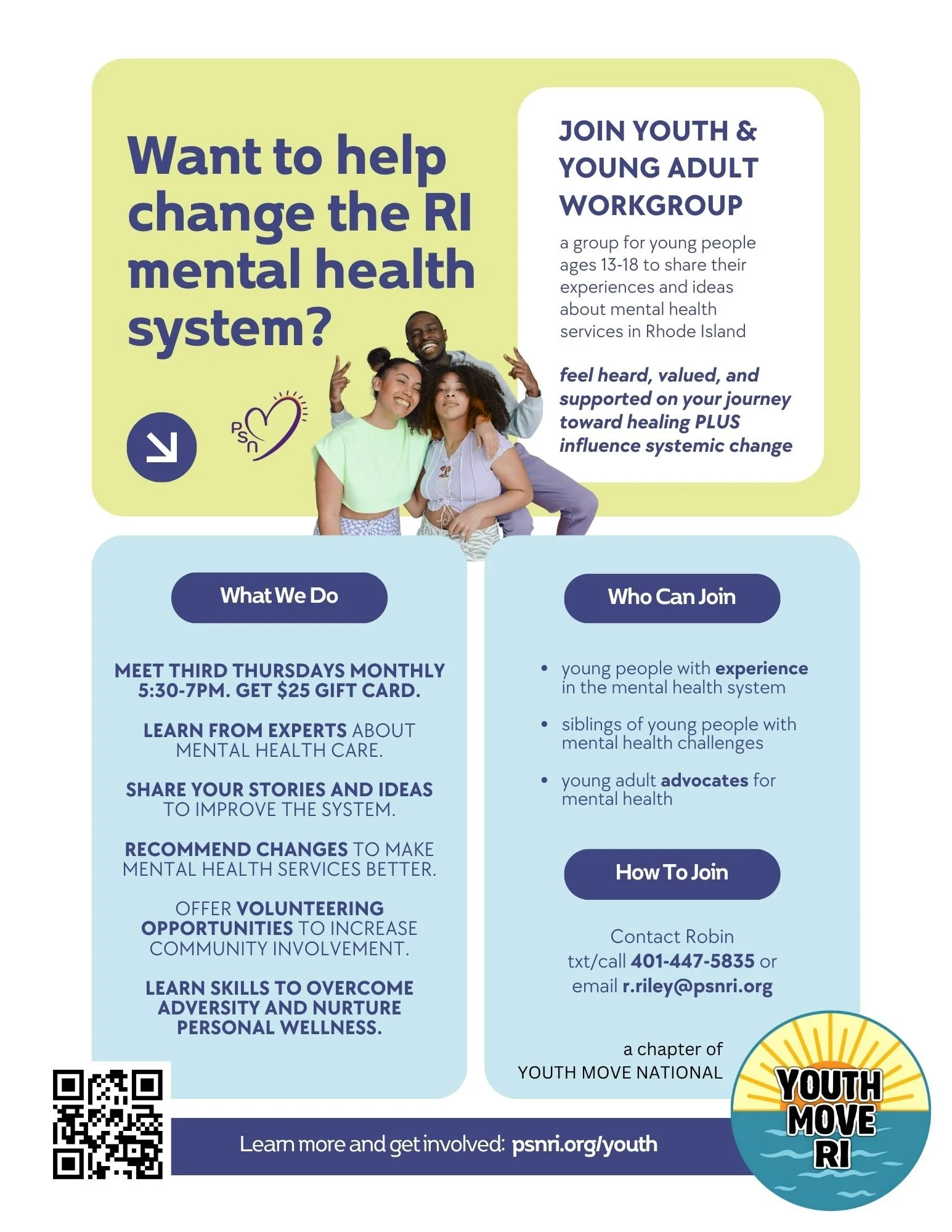 An empowering group for young people ages 13-18 to share their lived experience and ideas on how to improve mental health services in Rhode Island - help change the system!
